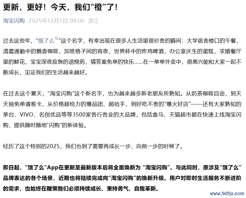 据淘宝闪购12月5日音问,即日起,“饿了么”App在更新至最新版块后将全面焕新为 “淘宝闪购”。与此同期,原触及“饿了么”品牌抒发的各个场景,近期也将链接完成向“淘宝闪购”的焕新升级。